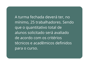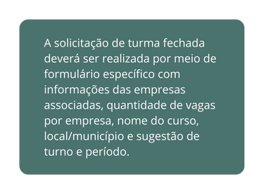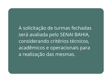 Os Sindicatos podem solicitar turmas fechadas de cursos de qualificação e/ou aperfeiçoamento profissional, nos municípios de atuação do SENAI BAHIA, de acordo com as demandas de seu segmento.